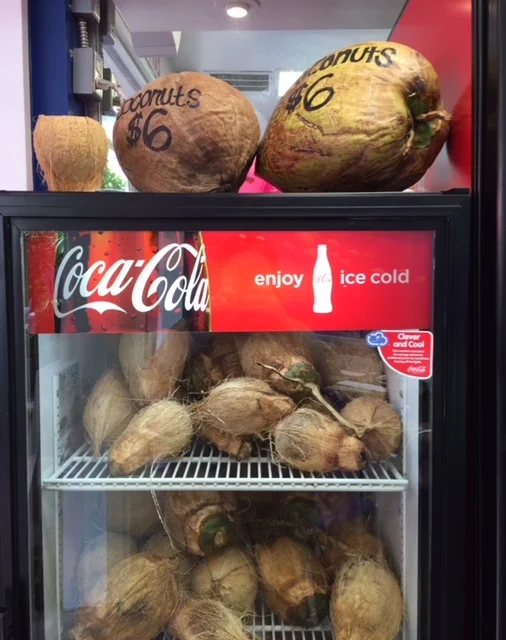 All natural, new local product - coconut water! As seen at the Hilton Hawaiian Village food court. The other Coke cooler had pineapples in it.
