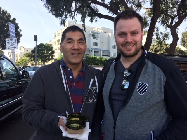 Japanese rice balls from Sunny Blue, the food of Robert's childhood. His mother would make these as snacks for their road trips. 3 flavors: salmon, miso mustard and sunny blue curry. Photo in the parking lot of the Santa Monica Farmer's market.