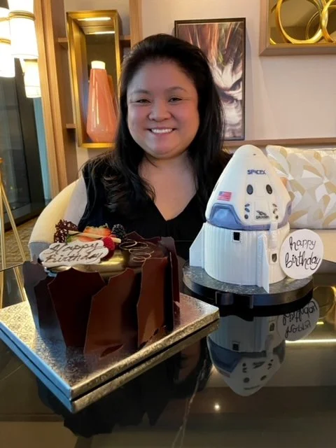 Norman was in Vegas to prepare for the CES show and drove with Bouramey, Cameron and Ryan. Van and Joe flew from LA on the morning of December 29th, as did me and Mike. Melisa arrived from Albuquerque and Shirley drove from Irvine. Doko arrived in the evening, and Dan, Nikki and Effie from New York. The Omicron variant had caused a lot of flights to be cancelled, so I’m glad we all made it. We had a private room for dinner at FUHU and also ate at the Famous Foods Street market, Genting Palace Lounge, Suns Out Buns Out, Alle 66 Lounge, Kitty Kitty Vice Den and the Zouk Nightclub to see Tiesto (even though there was a long line at 11pm and nobody thought I’d stay up that late). The $125 VIP entrance fee was well worth it to be able to feel 29 again! Tik and Kleinkemper sent a box with chocolate covered strawberries and prosecco to the room. And Resorts World did such an amazing job on Mike’s surprise SpaceX dragon cake and my chocolate one. I felt very lucky and happy at 50 to have such amazing family, friends and Mike.