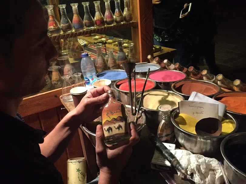The hotel had an amazing artist, Amir, at the resort. He created those designs from colored sand in a few minutes. I had my neighbor’s last name, Cunningham, translated to Arabic. Theirs turned out the best.